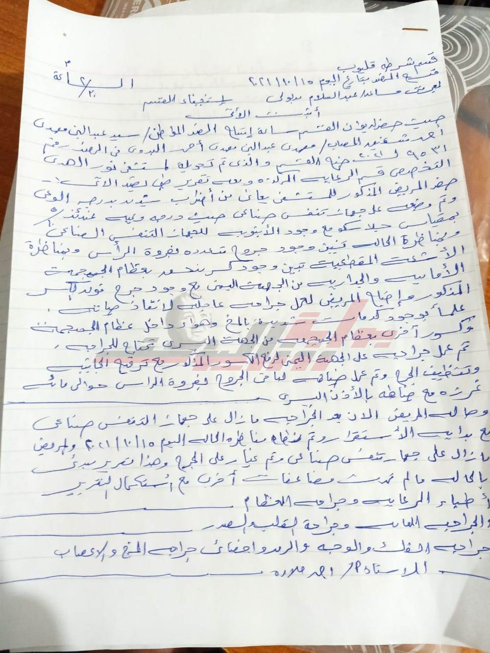 وتبين من الكشف الطبي بالمستشفى وجود كسر بعظام الجمجمة الأمامية والجدارية من الجهة اليمنى مع وجود جرح فوق الكسور المذكورة، وجار عمل جراحة عاجلة لإنقاذ حياته، كما تبين من التقرير وجود كدمات شديدة بالمخ وهواء داخل عظام الجمجمة وكسور أخرى بعظام الجمجمة تحتاج للجراحة مع ترقيع الجانبين وتنظيف الجرح وعمل صيانة لباقي الجروح بفروة الرأس حوالي ١٠٠ غرزة، والمريض ما زال على جهاز التنفس الصناعي.