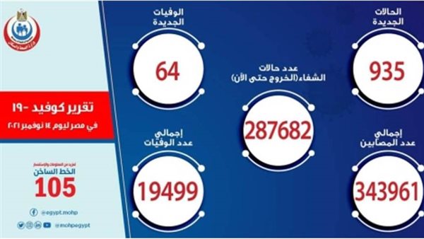 يُذكر أن إجمالي العدد الذي تم تسجيله في مصر بفيروس كورونا المستجد حتى الأحد، هو 343961 من ضمنهم 287682 حالة تم شفاؤها، و19499 حالة وفاة.