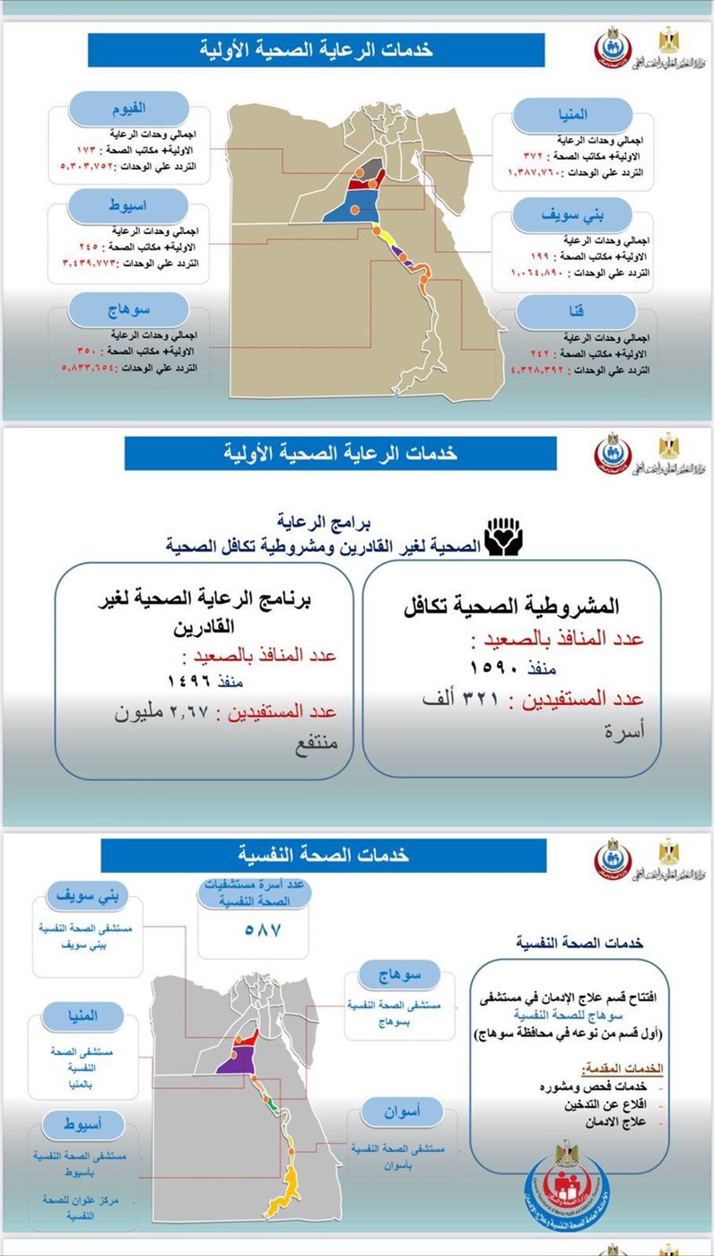 نشرت وزارة الصحة إنفوجرافا يوضح مشروعات تنمية الصحة بمحافظات الصعيد، في إطار توجه الدولة نحو تنمية الصعيد والنهوض به في كافة القطاعات.