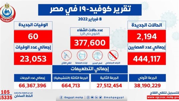 وأوضح الدكتور حسام عبد الغفار المتحدث الرسمي لوزارة الصحة والسكان، أنه تم تسجيل 2194 حالة جديدة ثبتت إيجابية تحاليلها للفيروس ومتحوراته، وذلك ضمن إجراءات الترصد والتقصي والفحوصات اللازمة التي تُجريها الوزارة وفقًا لإرشادات منظمة الصحة العالمية، لافتًا إلى وفاة 60 حالة جديدة.