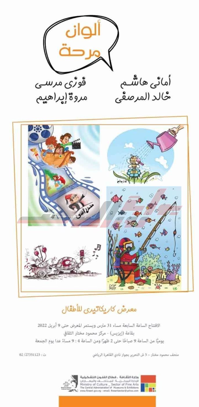 ضمن خطة نشاط وزارة الثقافة، وتحت رعاية الدكتورة إيناس عبد الدايم وزيرة الثقافة، يفتتح الدكتور خالد سرور، رئيس قطاع الفنون التشكيلية معرض كاريكاتير تحت عنوان "ألوان مرحة"، للفنانين فوزى مرسى، خالد المرصفى، أمانى هاشم، ومروة إبراهيم، وذلك في تمام الساعة السابعة مساء يوم الخميس الموافق 31 مارس الجاري، بقاعة "إيزيس" بمركز محمود مختار الثقافي.