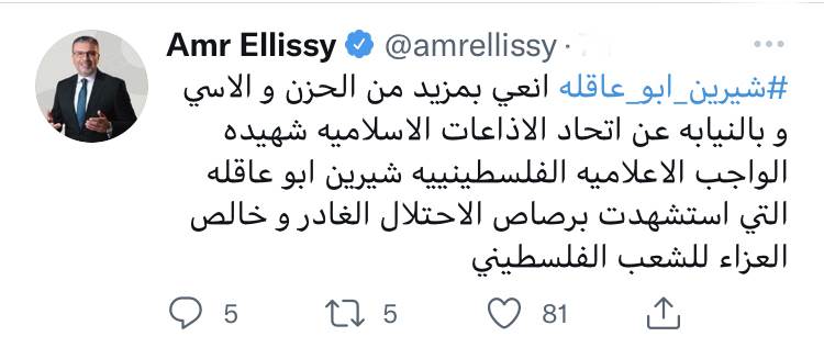 ونعي الاعلامي عمرو الليثي الشهيدة علي صفحته الرسمية بموقع التواصل الاجتماعي "تويتر" قائلا: " أنعي بمزيد من الاسي الإعلامية الفلسطينية شيرين ابو عاقلة التي استشهدت برصاص الاحتلال الغادر وهي تؤدي عملها بمنتهي المصداقية والمهنية و خالص العزاء للشعب الفلسطيني وإنا لله وإنا إليه راجعون".