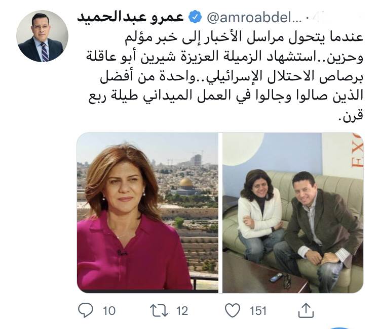 ووصف الاعلامي عمرو عبدالحميد والذي نشر صورة له بصحبة الاعلامية الشهيدة الحادث "عندما يتحول مراسل الأخبار إلى خبر مؤلم وحزين.. استشهاد الزميلة العزيزة شيرين أبو عاقلة برصاص الاحتلال الإسرائيلي.. واحدة من أفضل الذين صالوا وجالوا في العمل الميداني طيلة ربع قرن".