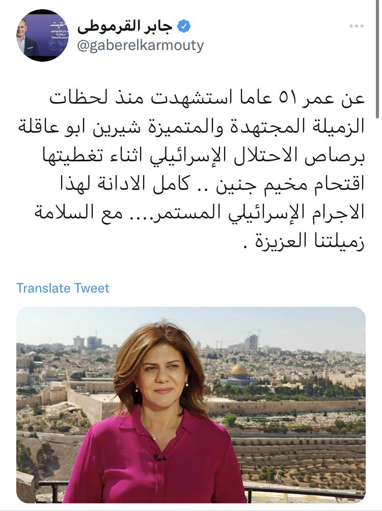 وغرد الاعلامي جابر القرموطي علي صفحته الرسمية بموقع التواصل الاجتماعي "تويتر" مدينًا الجرم الاسرائيلي قائلا: "عن عمر ٥١ عاما استشهدت منذ لحظات الزميلة المجتهدة والمتميزة شيرين ابو عاقلة برصاص الاحتلال الإسرائيلي أثناء تغطيتها اقتحام مخيم جنين .. كامل الادانة لهذا الإجرام الإسرائيلي المستمر.... مع السلامة زميلتنا العزيزة".