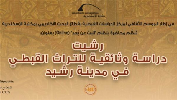تنظم مكتبة الإسكندرية رابع محاضرات الموسم الثقافي القبطي الثاني عشر، بعنوان "رشيت.. دراسة وثائقية للتراث القبطي في مدينة رشيد"، والتي يحاضر فيها الأستاذ سعيد رخا مدير عام متحف رشيد الوطني، وذلك عن طريق البث عن بُعد (Online)، يوم الثلاثاء الموافق 30 مايو 2022، الساعة 4.00 مساءً.