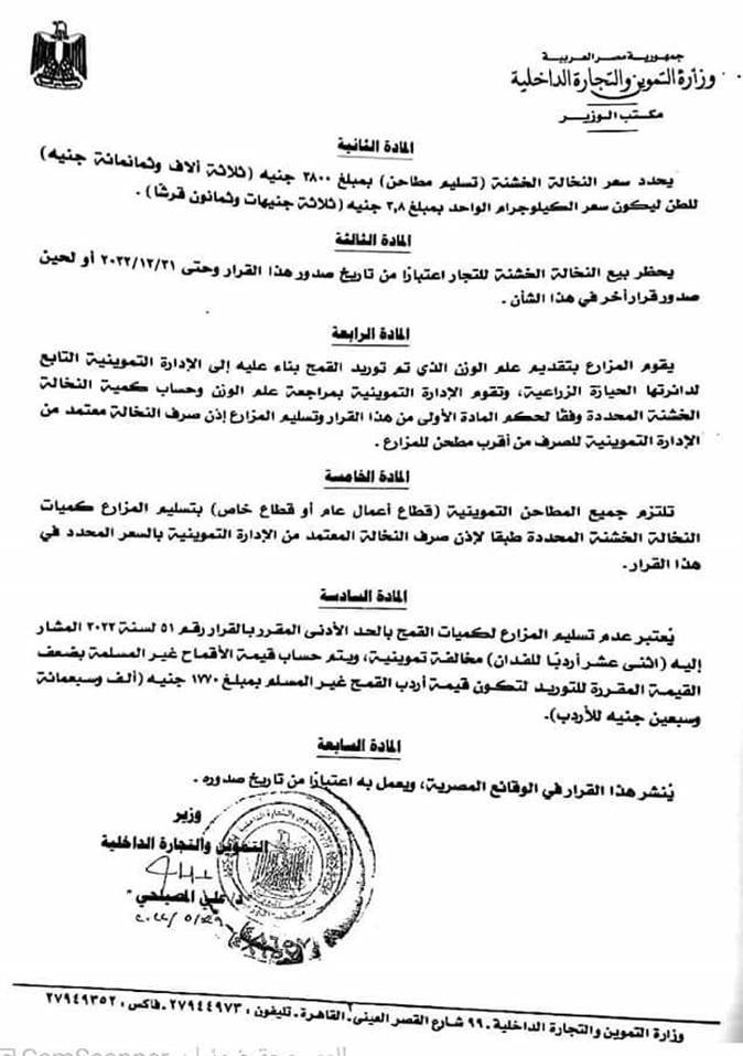 وأضاف المحافظ أن قرار وزير التموين نص على إنه تم تحديد سعر النخالة الخشنة (تسليم مطاحن) بمبلغ 3800 جنيه للطن ليكون سعر الكيلو جرام الواحد بمبلغ 3.8 جنيه مصري ويحظر بيع النخالة الخشنة للتجار اعتبارًا من تاريخ صدور القرار وحتى 31 / 12 / 2022 أو لحين صدور قرار آخر في هذا الشأن كما تضمن القرار أن يقوم المزارع بتقديم علم الوزن الذي تم توريد محصول القمح بناءًا عليه إلى الإدارة التموينية التابع لدائرتها الحيازة الزراعية وتقوم الإدارة التموينية بمراجعة علم الوزن وحساب كمية النخالة الخشنة الموردة وفقًا لحكم المادة الأولى من هذا القرار وتسليم المزارع إذن صرف النخالة معتمد من الإدارة التموينية للصرف من أقرب مطحن للمزارع.