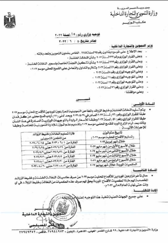 ووجه محافظ أسيوط مسؤولى التموين ورؤساء المراكز بتكثيف الجهود وتكثيف عمل لجان الحصر للحيازات الزراعية ومعدلات التوريد طبقاً لتصنيفات الحيازة الزراعية وكارت الفلاح وتحرير المحاضر للمخالفين الرافضين للتوريد ووقف صرف حصة الاسمدة المقررة لهم ووقف البطاقات التموينية المقررة لهم مشيرًا إلى إنه يعتبر عدم تسليم المزارع لكميات من القمح بالحد الأدنى المقرر بالقرار رقم 51 لسنة 2022 المشار اليه (اثنى عشر أردباً للفدان) مخالفة تموينية ويتم حساب قيمة الأقماح غير المسلمة بضعف القيمة المقررة للتوريد لتكون قيمة أردب القمح غير المسلم بمبلغ 1770 جنيها للأردب.