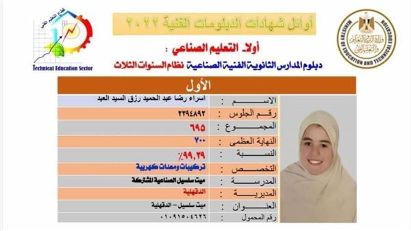 وقالت الأولى على الدبلومات الفنية، إنها حصلت على مجموع عالٍ في الشهادة الإعدادية، يؤهلها للالتحاق بالثانوية العامة، لكنها فضلت الثانوي الصناعي خوفًا من نظام التابلت الجديد.