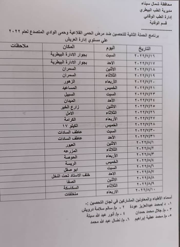 وأصدر اللواء أسامة أحمد عَفش رئيس مركز ومدينة العريش تعليماته لرؤساء مناطق الخدمات ورؤساء القرى التابعة لمركز ومدينة العريش بتقديم كل الدعم اللوجستى لنجاح الحملة وتأمين التحرك والانتقال داخل نطاق كل منطقة خدمات طبقا لما هو وارد فى الجدول المحدد من الطب البيطرى حتى يوم الأربعاء الموافق 10 أغسطس المقبل وتمكين الحملة من دخول مناطق التجمعات الحيوانية.